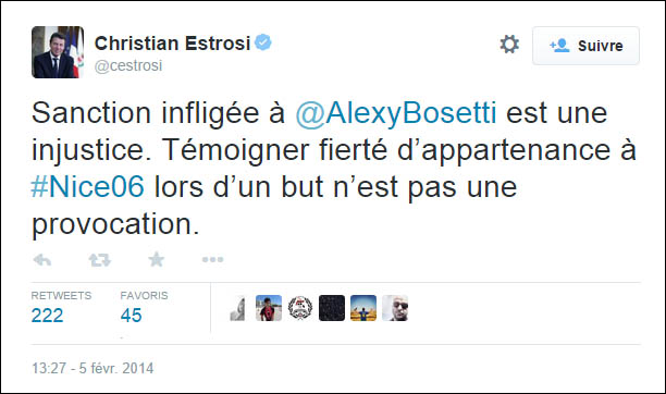 A twittosfera s'occupa d'ellu è ritrova stu tweet di ferraghju 2014, quandu stu catinone avia purtatu u so sustegnu à Bosetti, sanziunatu per avè pruvucatu i sustenidori di l'OM dop'à avè marcatu à u Vélodrôme.
