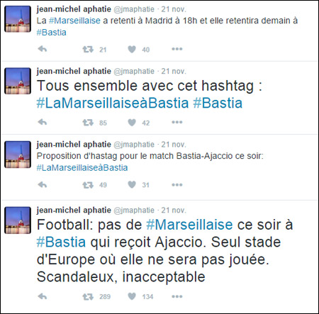 È chì face u giurnalistu Jean-Michel Aphatie u sabbatu matina ? S'annoia. Hè ellu chì lancia u hashtag #LaMarseillaiseàBastia.