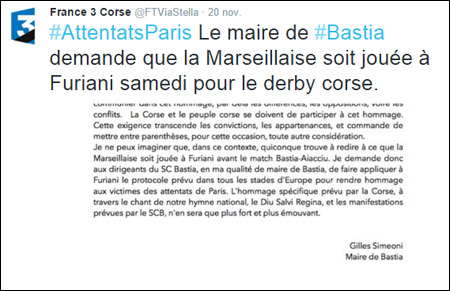 Ma subbitu, a nutizia hè accurtata à una frasa : "i Corsi ùn sò micca sulidarii di l'attentati, ùn volenu rende omagiu à e vittime, ùn volenu a Marseillaise".