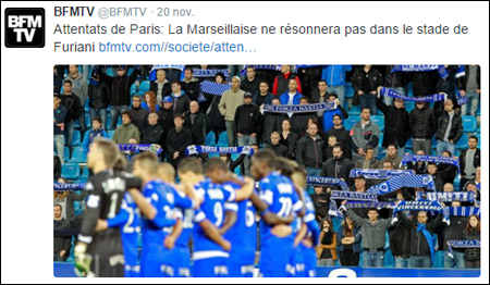 Tuttu principia venneri sera. Pè rende omagiu à e vittime di l'attentati di Parigi è à u so educatore Dumè Albertini, u Sporting annunzia nant'à u so situ un protocolu differente di quellu impostu da a LFP : Diu vi salvi Regina, ballò cappiati in celu, minutu sciaccamanatu... ma micca Marseillaise.