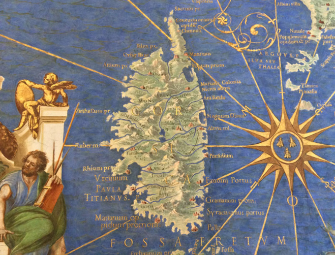 Una grande pittura realizata in u 1585 seculu fatta da Tommaso Laureti, rapresenta u "trionfu di a religione cristiana". Trà tutte e "regione d'Italia" rapresentate, (ùn vi scurdate, semu à a fine di u XVIu seculu) ci si trova... a Corsica. L'alleguria rapresenta a Corsica sott'à a forma d'una donna cù una spada.